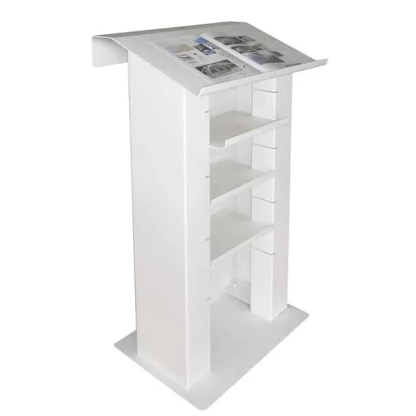 The Trilite Cabinet Lectern is a wide, folded metal lectern featuring built-in shelving designed to hold literature and electrical equipment. Its premier-style top can accommodate a light, microphones, and computer links, making it an excellent choice for presentations, conferences, and events where AV integration and graphics are required.